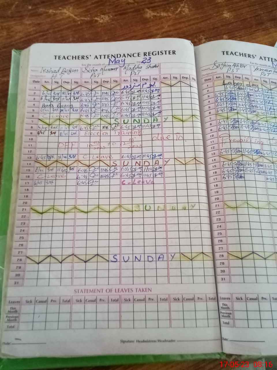 | Total no. of Classrooms: 4 No. of Classrooms Used for Teaching: 4 No. of Classrooms Storing Old Furniture, FTBs, etc: 0Comments if Any: Attendance Register of after noon student and teacher not shown to mea due to this reason all student and teacher mark as absent dated 17 5 23 |