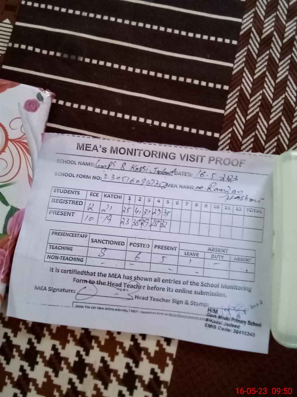 | Attendance Register | Head Teacher | MEA with School | Visit Proof |
