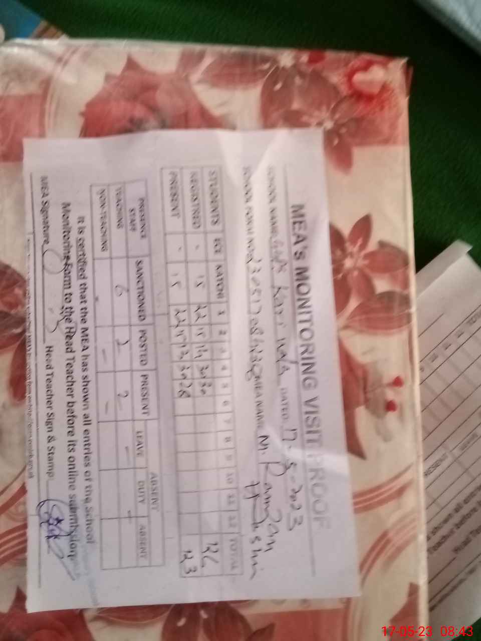 | Attendance Register | Head Teacher | MEA with School | Visit Proof |