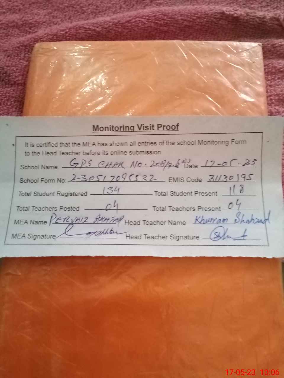 | Attendance Register | Head Teacher | MEA with School | Visit Proof |