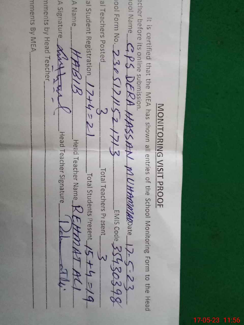 | Attendance Register | Head Teacher | MEA with School | Visit Proof |