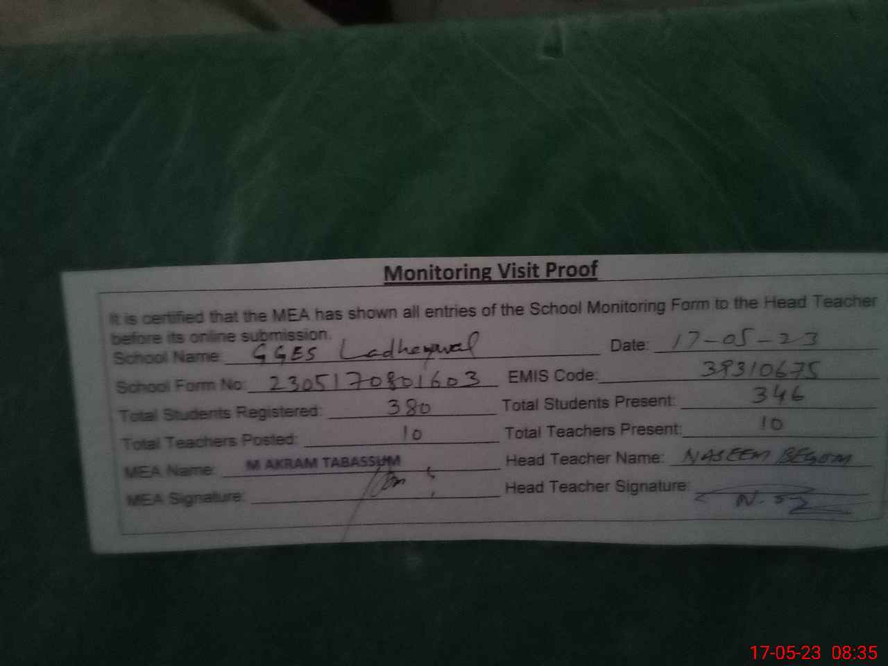 | Certified that this School was Inspected by the Undersigned MEA/DMO Today and the Information Stated Above is as Per Record. | |||||