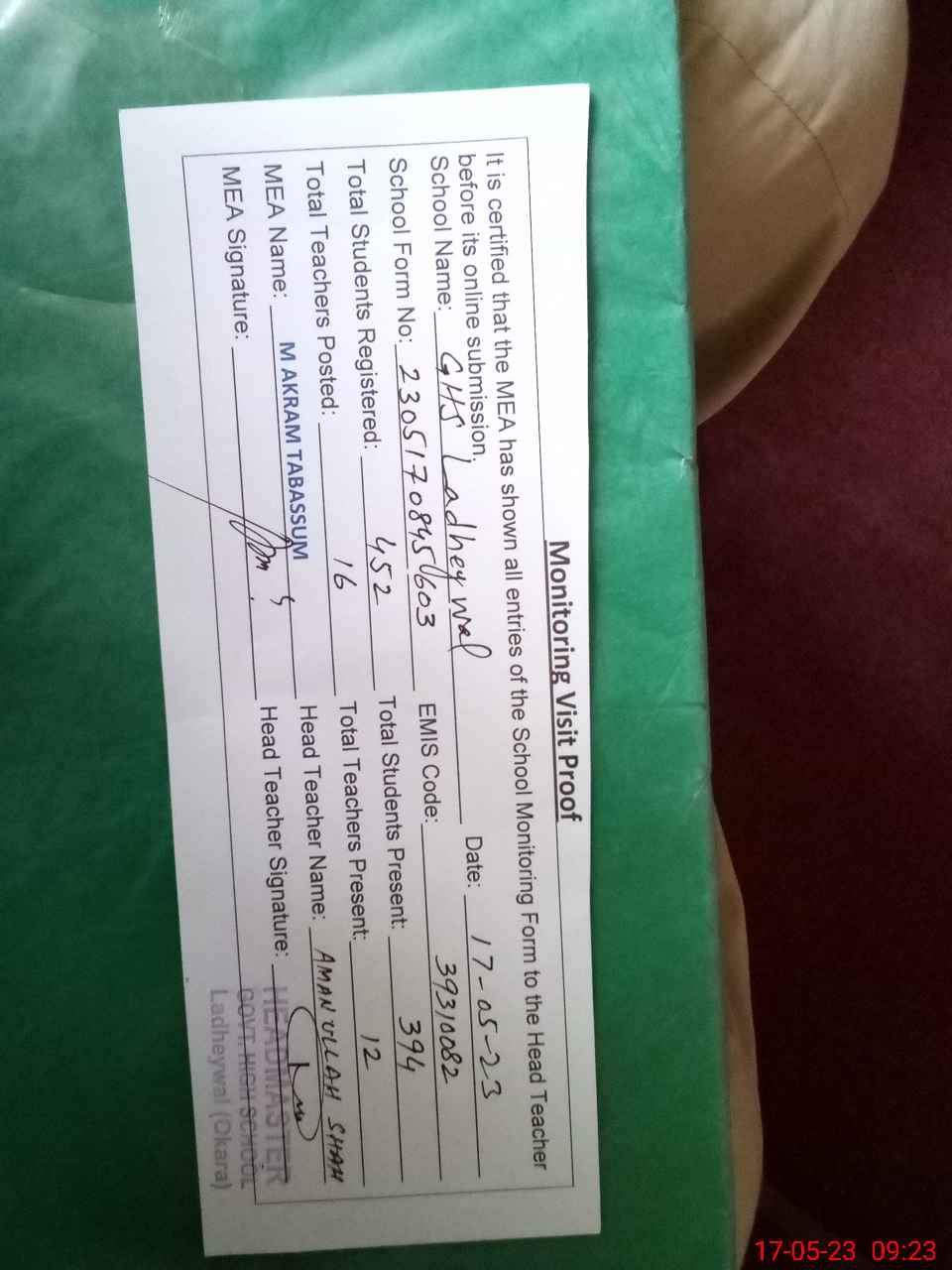 | EMIS Code: 39310082 | Name of School: GHS LADHEY WAL | |||