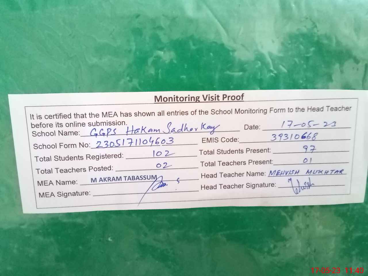 | Attendance Register | Head Teacher | MEA with School | Visit Proof |