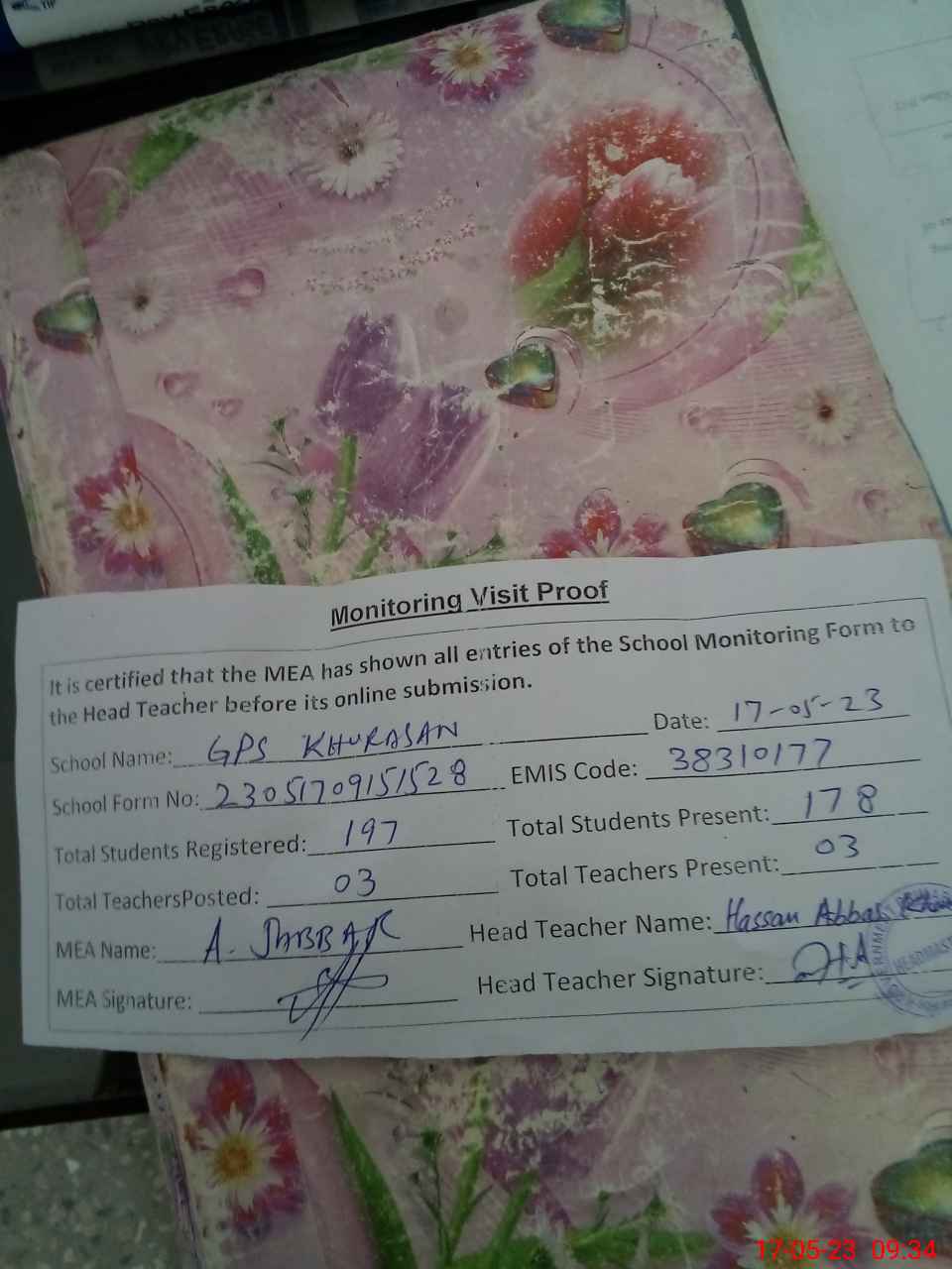 | Attendance Register | Head Teacher | MEA with School | Visit Proof |