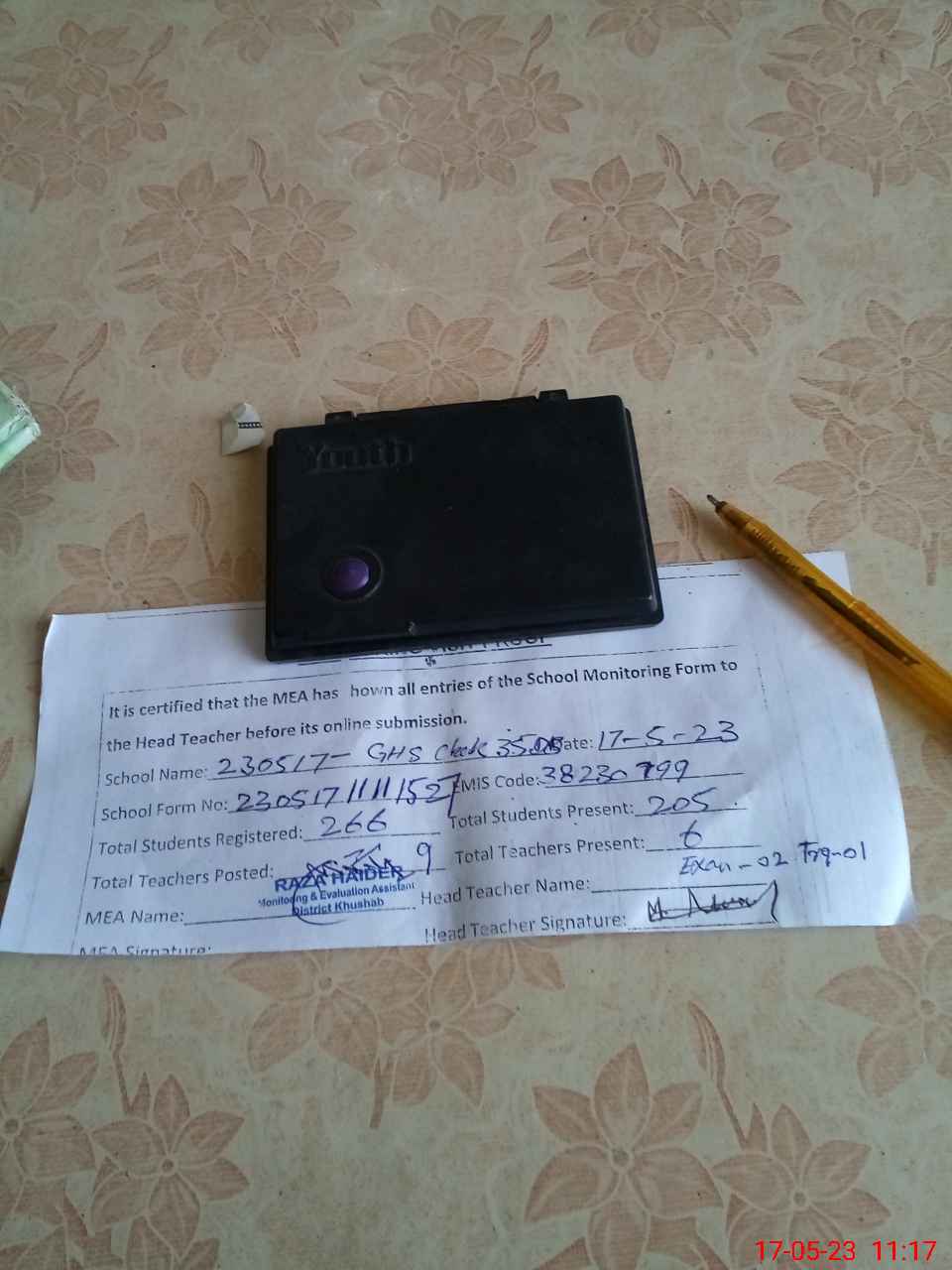 | Attendance Register | Head Teacher | MEA with School | Visit Proof |