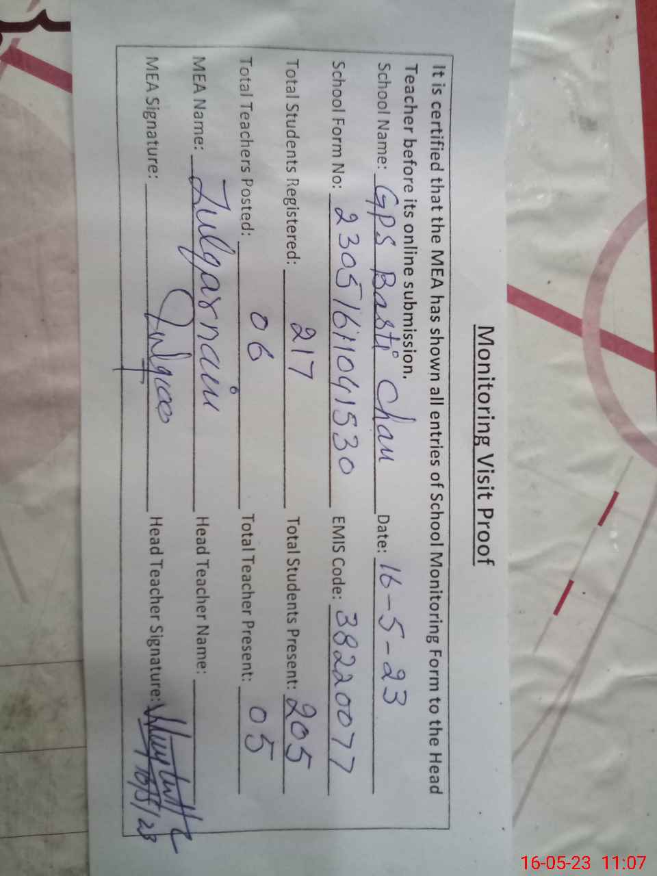| Attendance Register | Head Teacher | MEA with School | Visit Proof |