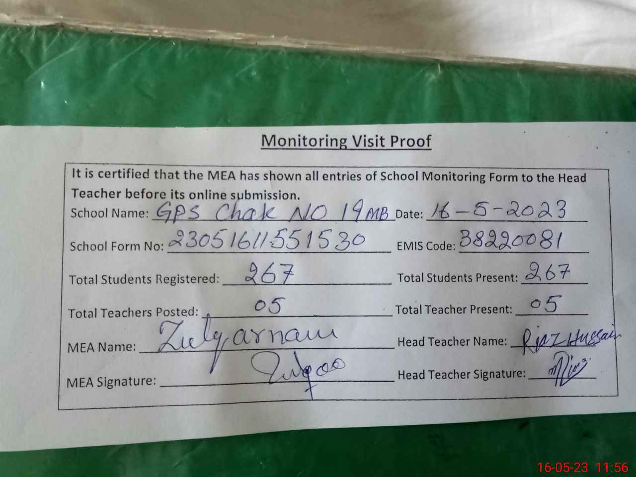 | EMIS Code: 38220081 | Name of School: GPS CHAK NO. 19 MB | |||