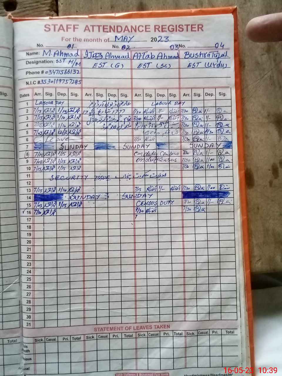 | Name: MU**** AH**** Designation: (School Headmaster's/Headmistress's) SST GEN Phone/Cell Number: 03**** |
