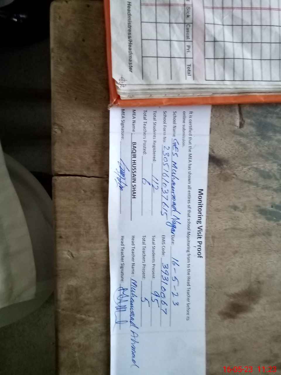 | Attendance Register | Head Teacher | MEA with School | Visit Proof |