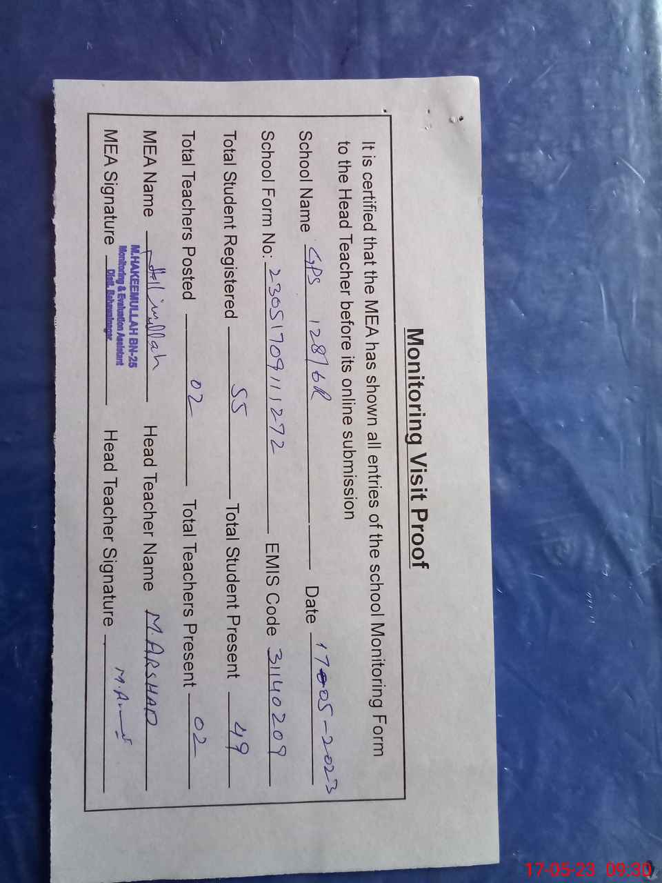 | Attendance Register | Head Teacher | MEA with School | Visit Proof |