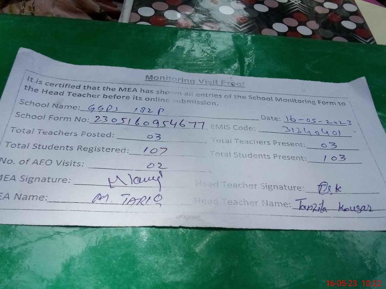 | Attendance Register | Head Teacher | MEA with School | Visit Proof |