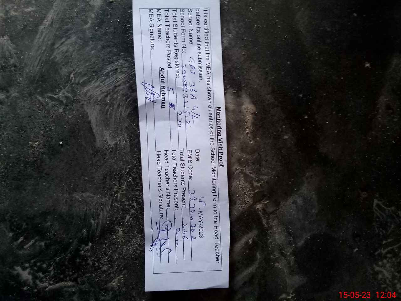 | Attendance Register | Head Teacher | MEA with School | Visit Proof |