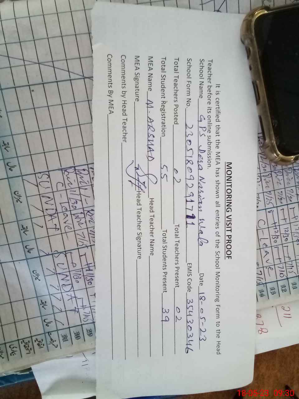 | Attendance Register | Head Teacher | MEA with School | Visit Proof |