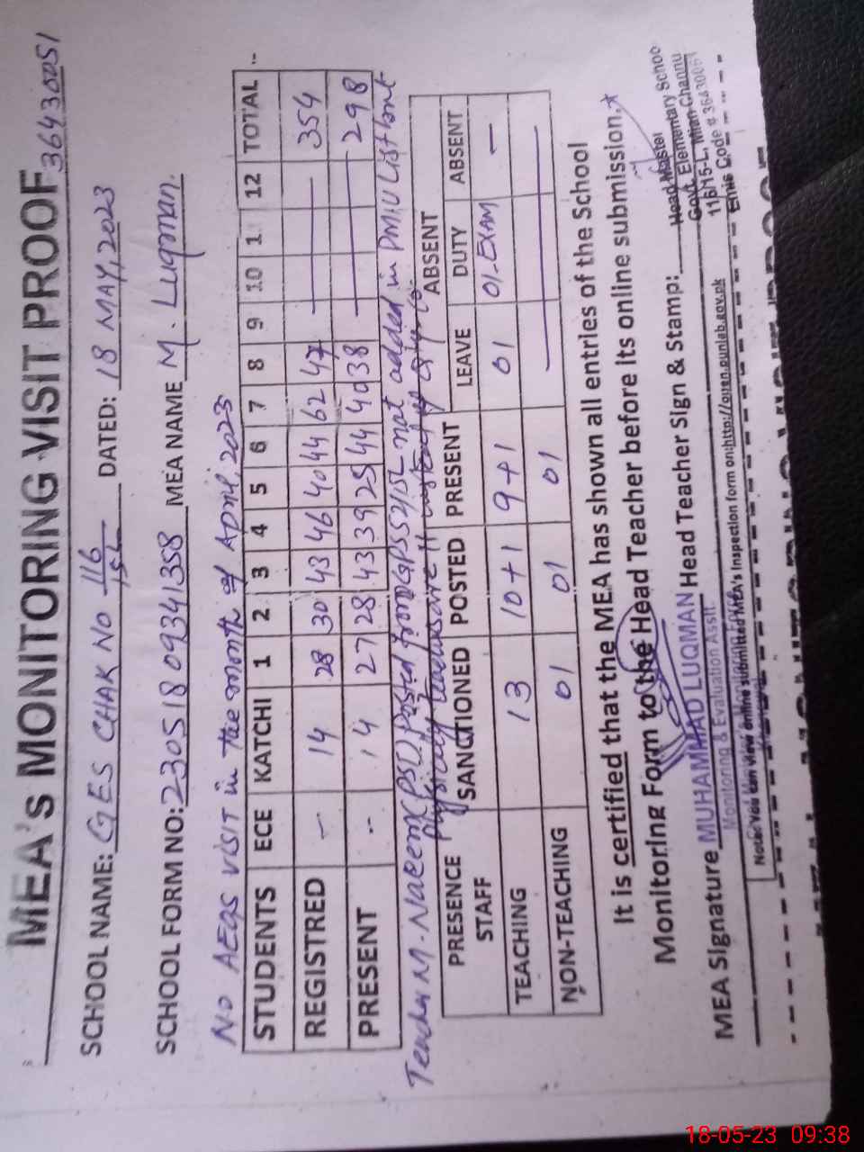 | EMIS Code: 36430051 | Name of School: GES 116/15-L, MIAN CHANNU | |||