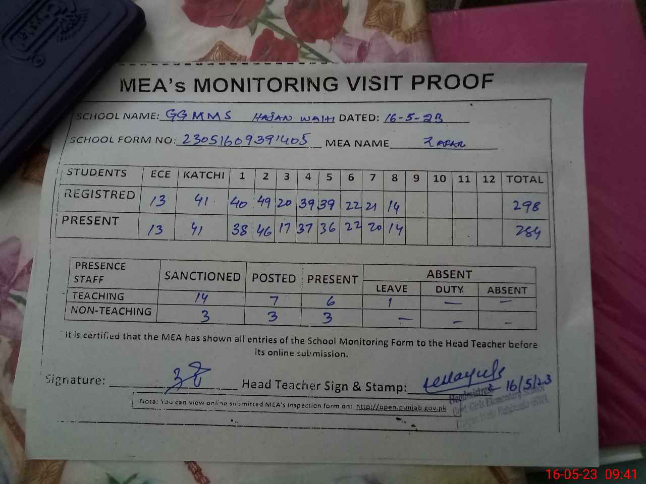 | Attendance Register | Head Teacher | MEA with School | Visit Proof |