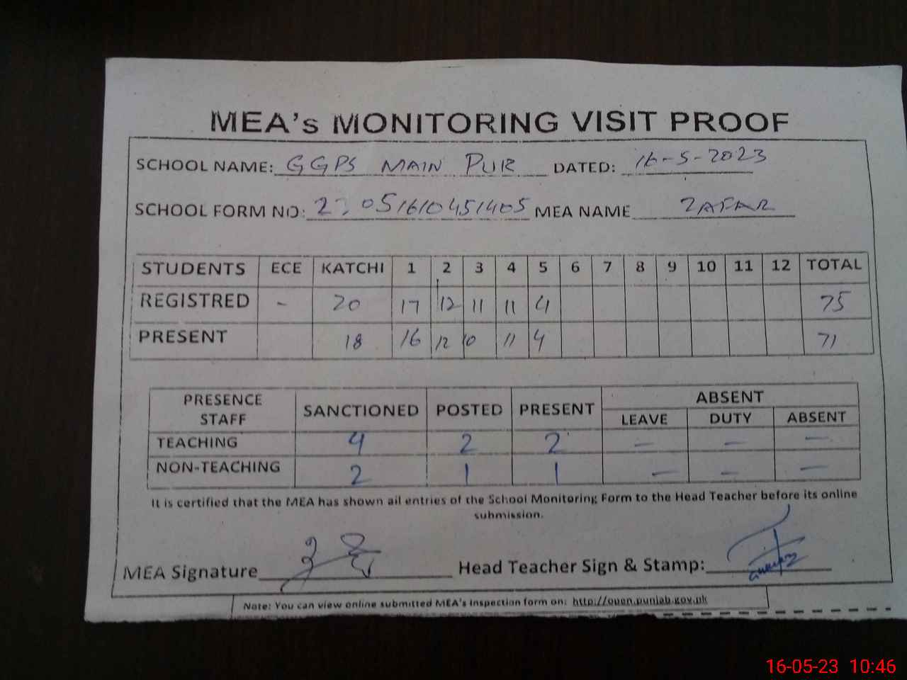 | Attendance Register | Head Teacher | MEA with School | Visit Proof |