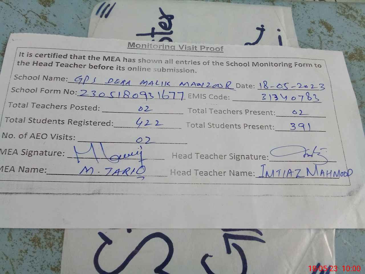 | EMIS Code: 31340783 | Name of School: GPS DERA MALIK MANZOOR | |||