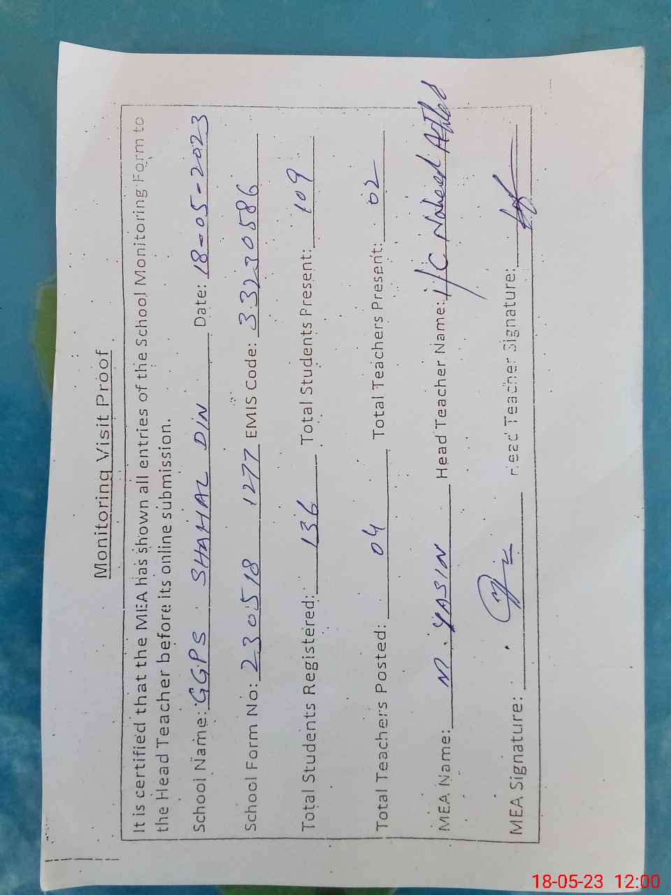 | EMIS Code: 33230586 | Name of School: GGPS SHAHAL DIN | |||