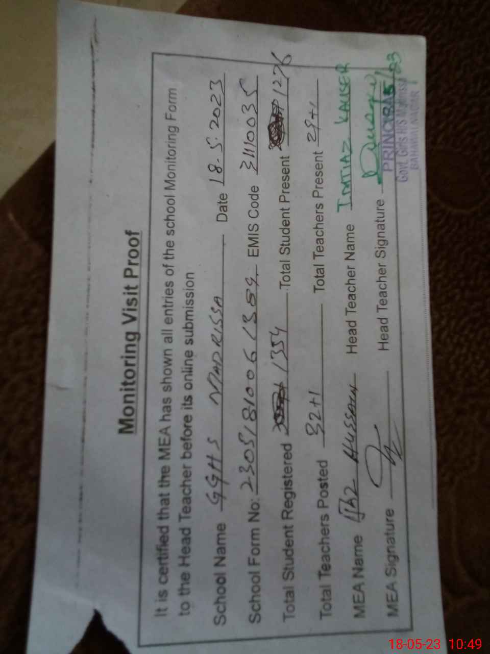 | Attendance Register | Head Teacher | MEA with School | Visit Proof |