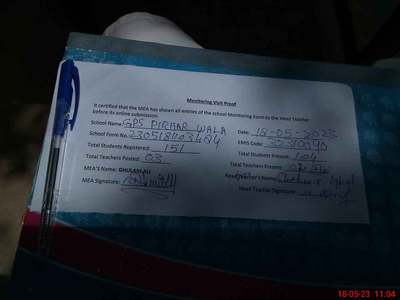 | Attendance Register | Head Teacher | MEA with School | Visit Proof |