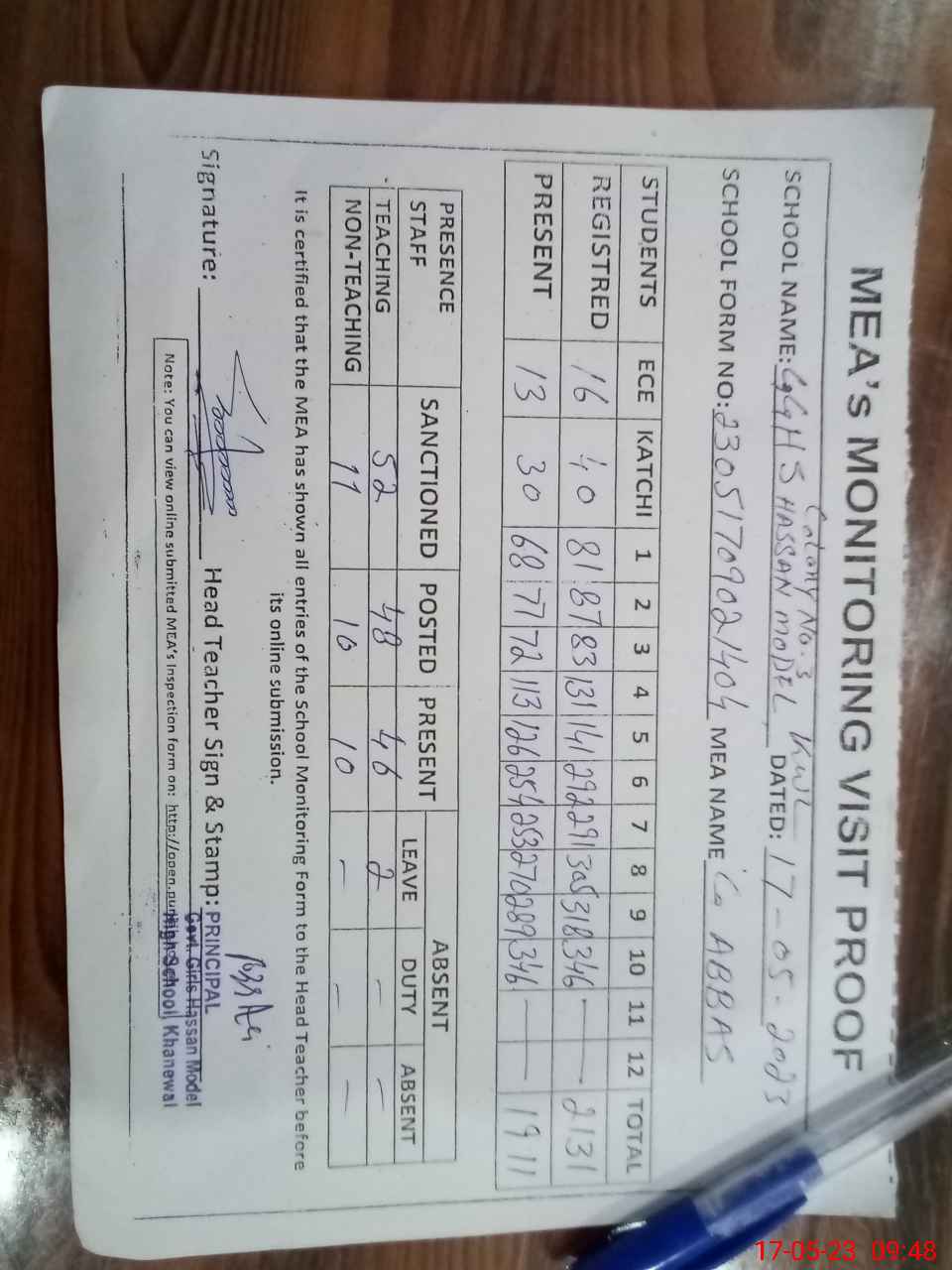 | Attendance Register | Head Teacher | MEA with School | Visit Proof |
