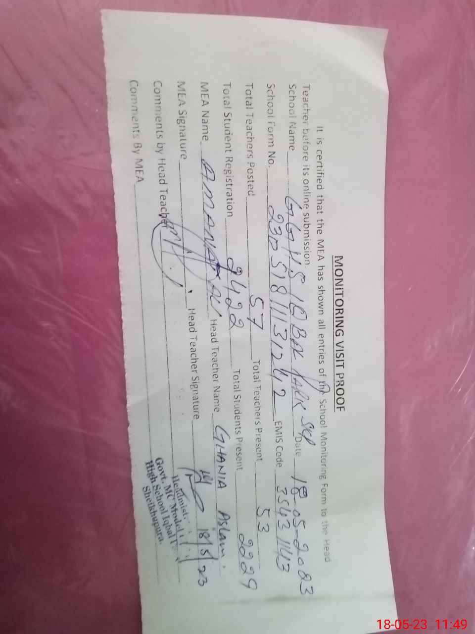 | Attendance Register | Head Teacher | MEA with School | Visit Proof |