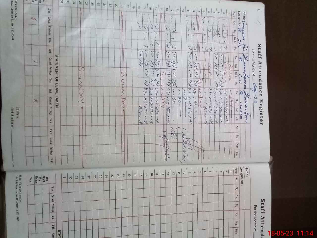 | CNIC | Full Name | Designation | R/C | Absence During Last Calender Month |