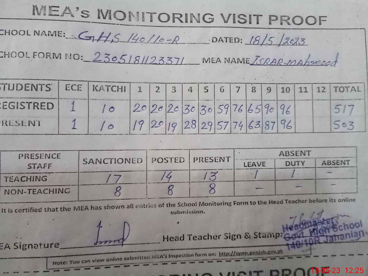 | Attendance Register | Head Teacher | MEA with School | Visit Proof |