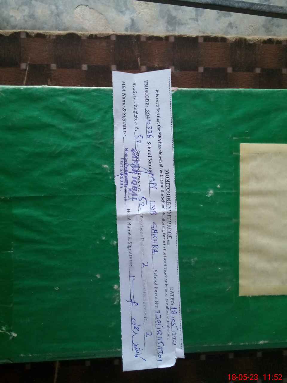 | Certified that this School was Inspected by the Undersigned MEA/DMO Today and the Information Stated Above is as Per Record. | |||||