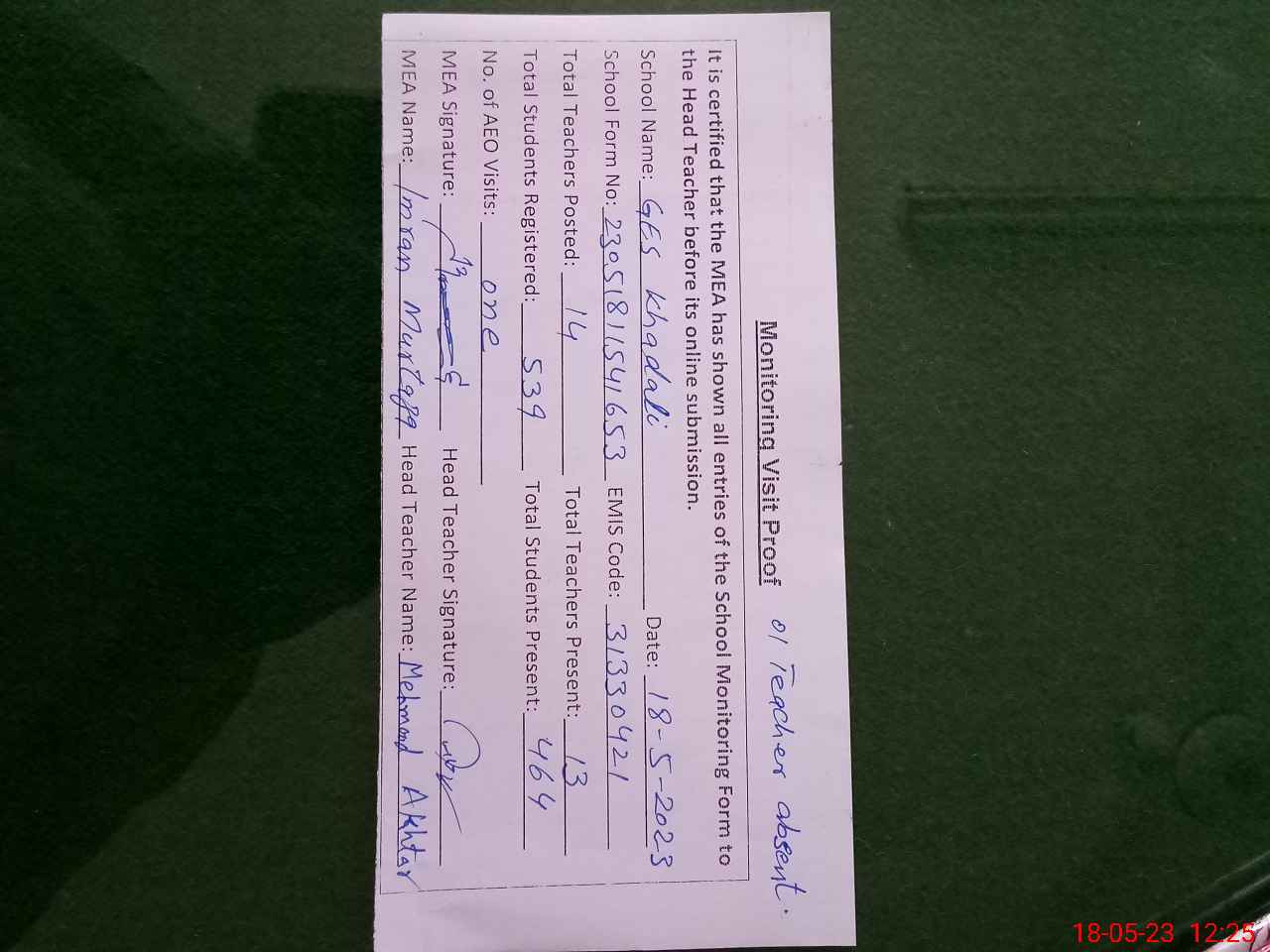 | Attendance Register | Head Teacher | MEA with School | Visit Proof |