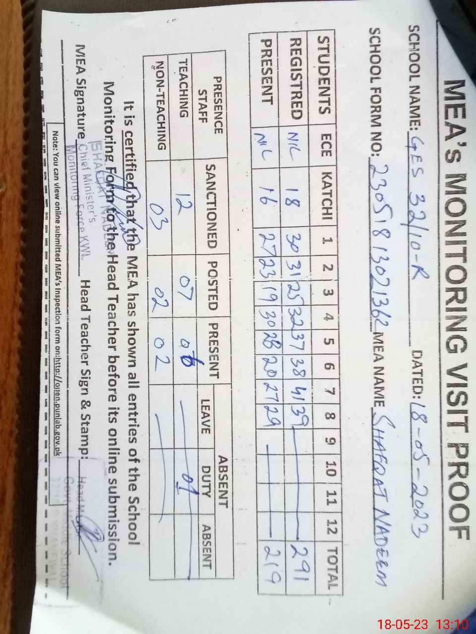 | Attendance Register | Head Teacher | MEA with School | Visit Proof |