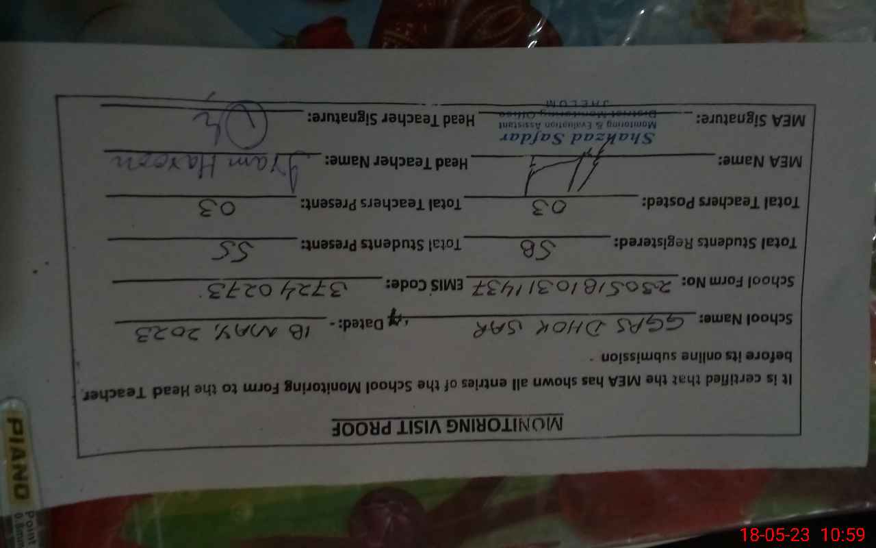 | EMIS Code: 37240273 | Name of School: GGPS DHOK SAR | |||
