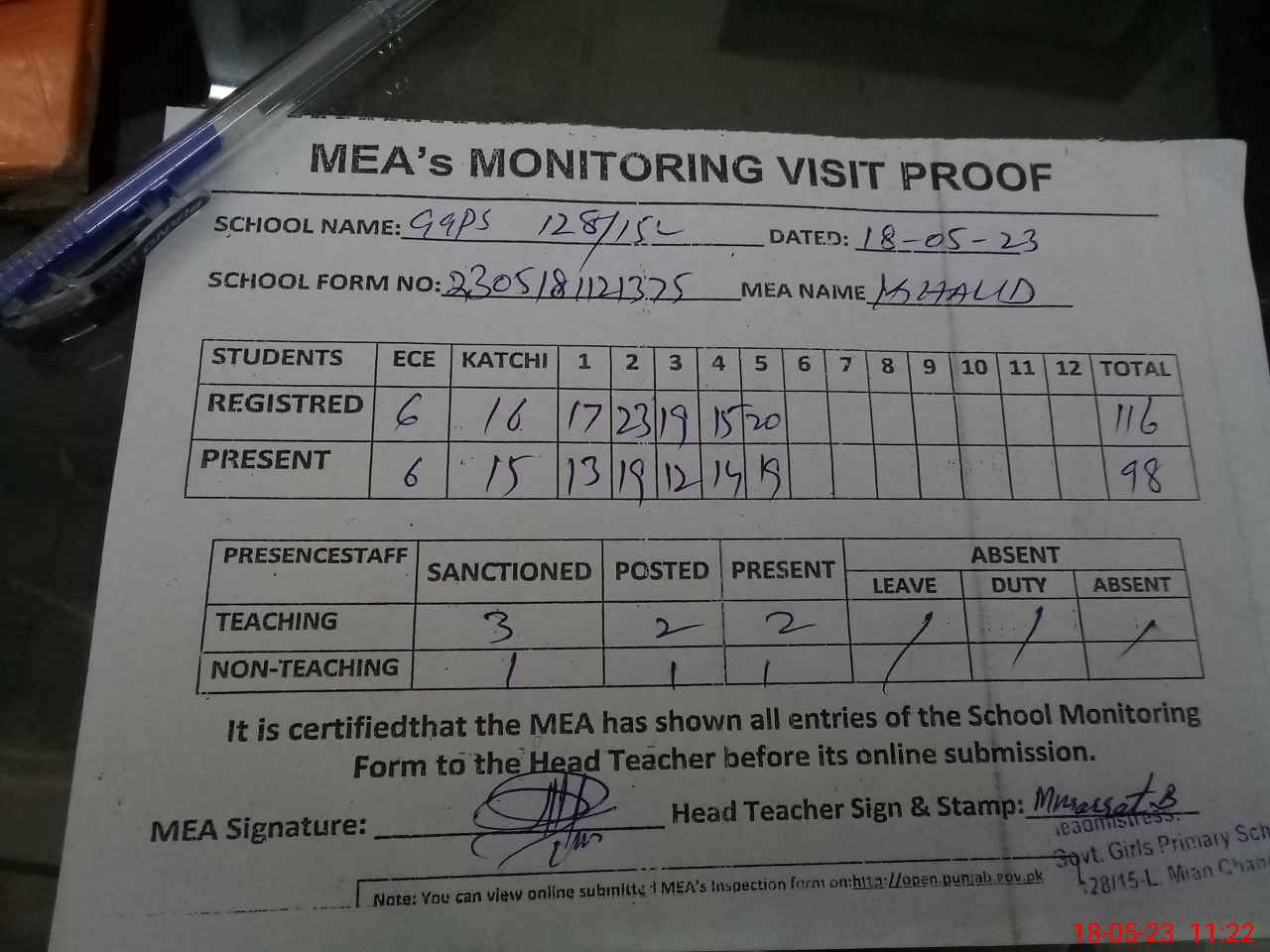 | Attendance Register | Head Teacher | MEA with School | Visit Proof |