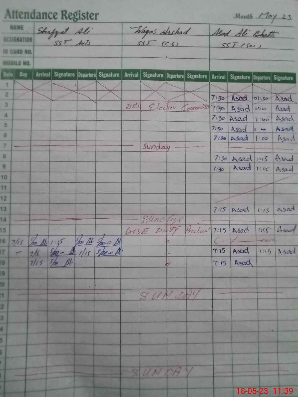 | 33**** | Mu**** Aj**** Kh**** | PST | Regular | 0 | 0 | 0 | 0 | 0 | 0 | 0 | 0 | 0 | Exam Duty |