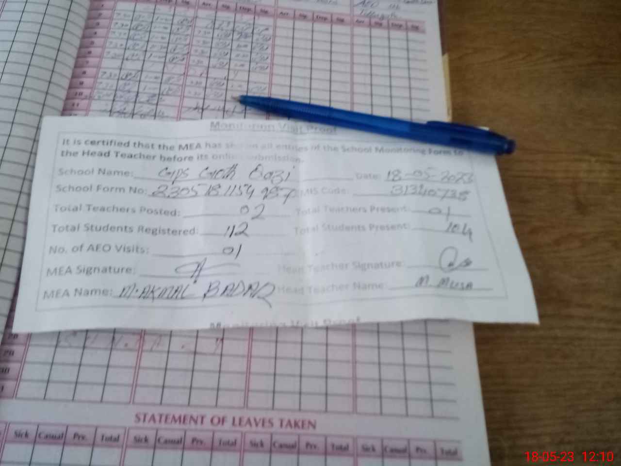 | Attendance Register | Head Teacher | MEA with School | Visit Proof |