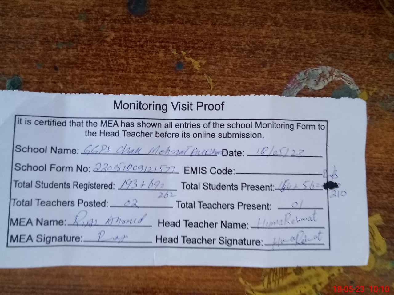 | Attendance Register | Head Teacher | MEA with School | Visit Proof |