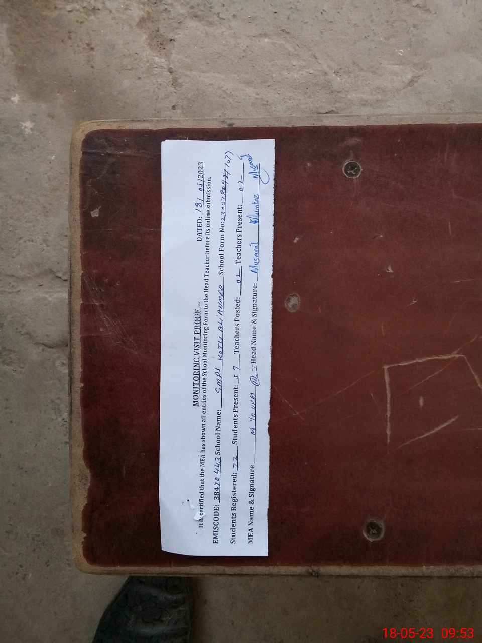 | Attendance Register | Head Teacher | MEA with School | Visit Proof |