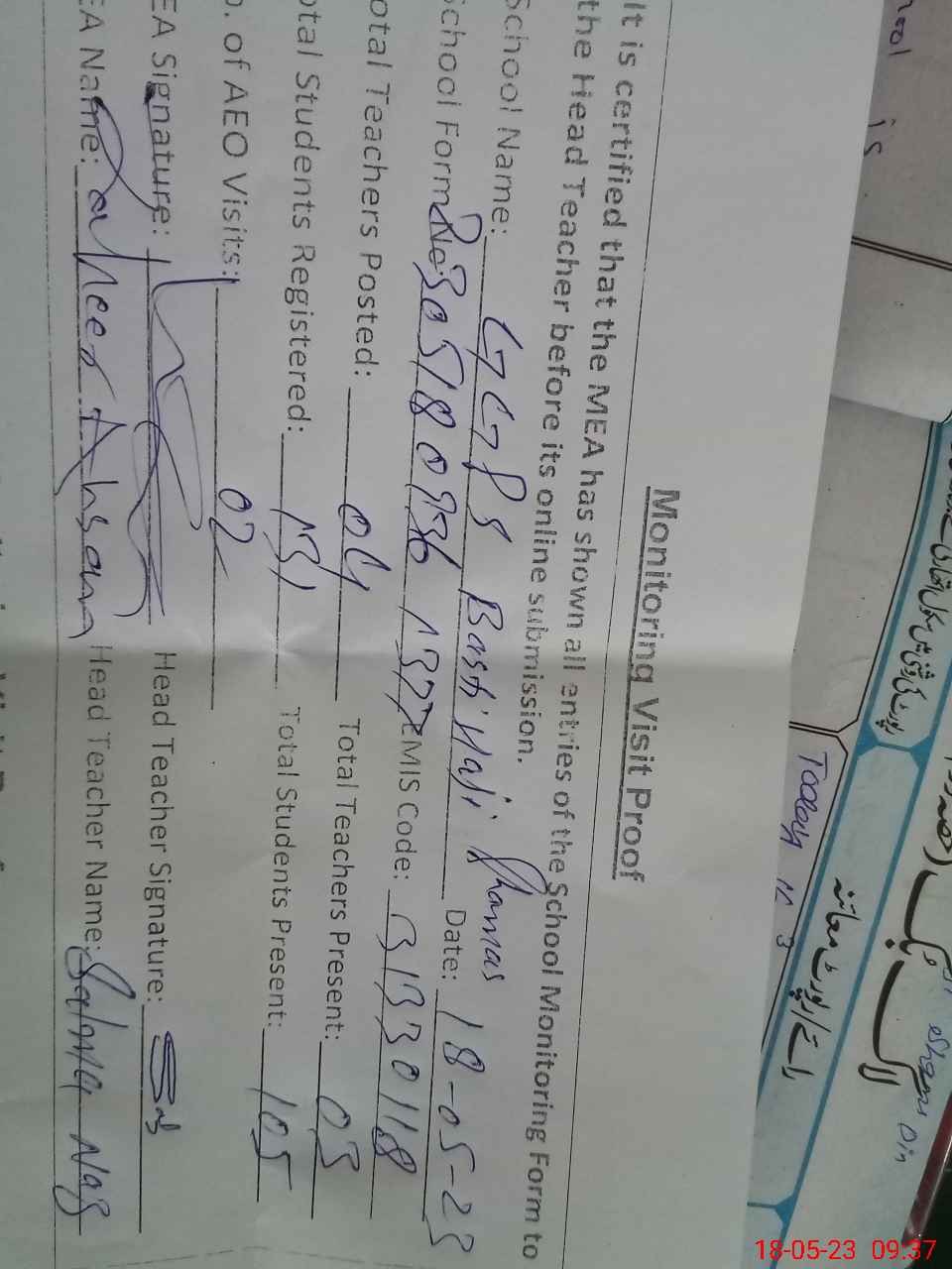 | Attendance Register | Head Teacher | MEA with School | Visit Proof |