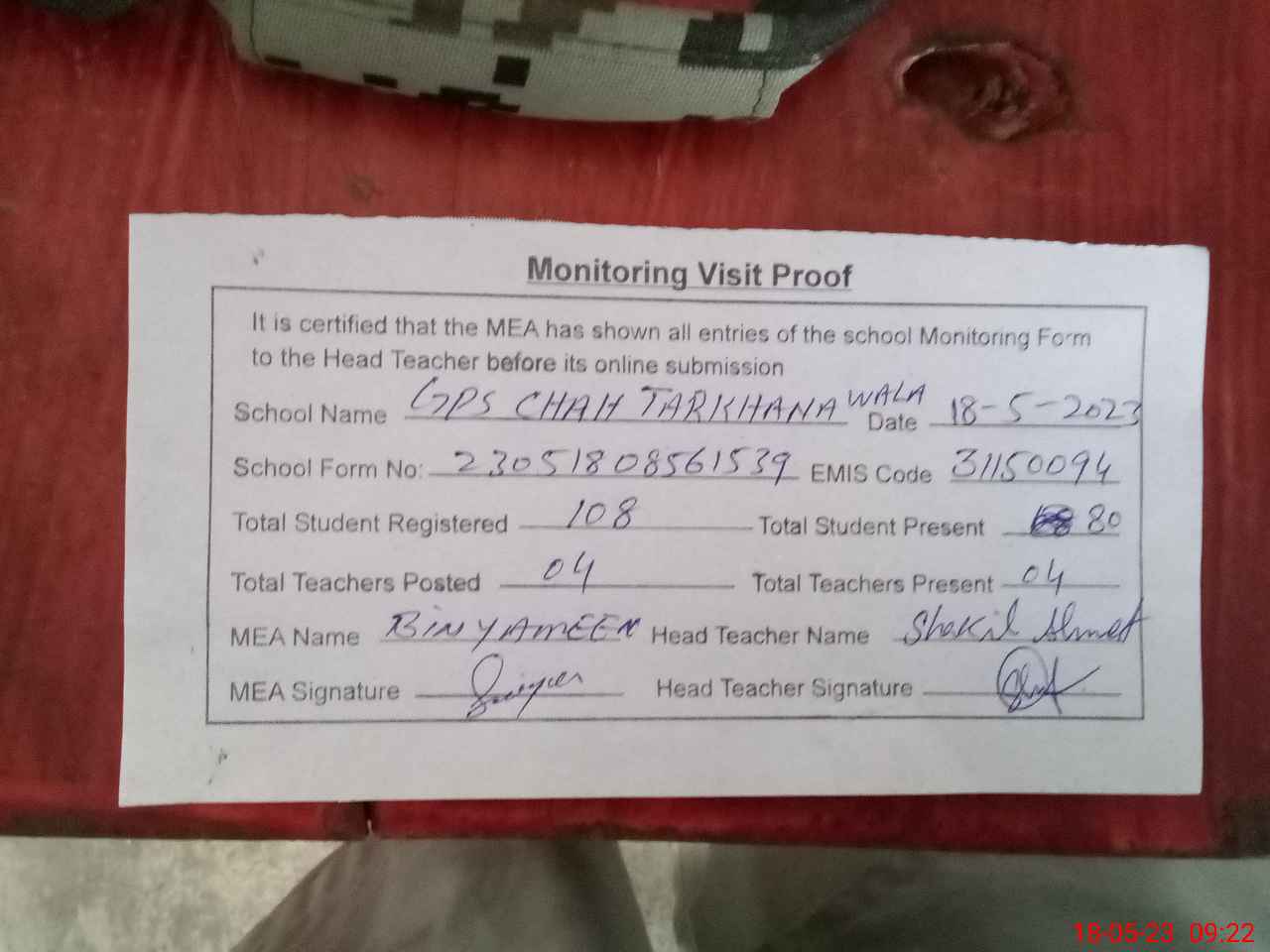 | EMIS Code: 31150094 | Name of School: GPS CHAH TARKHANA WALA | |||