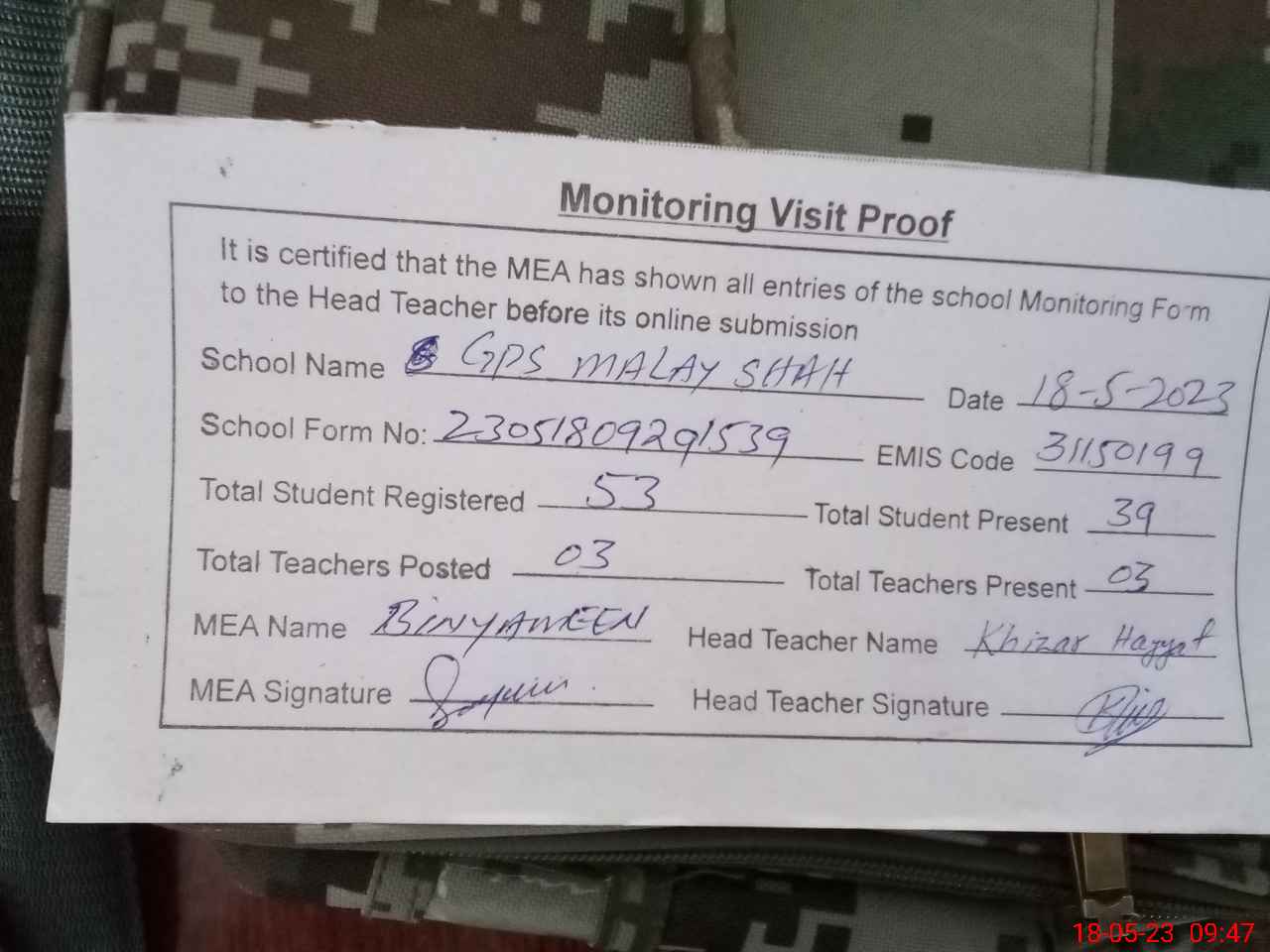 | Attendance Register | Head Teacher | MEA with School | Visit Proof |