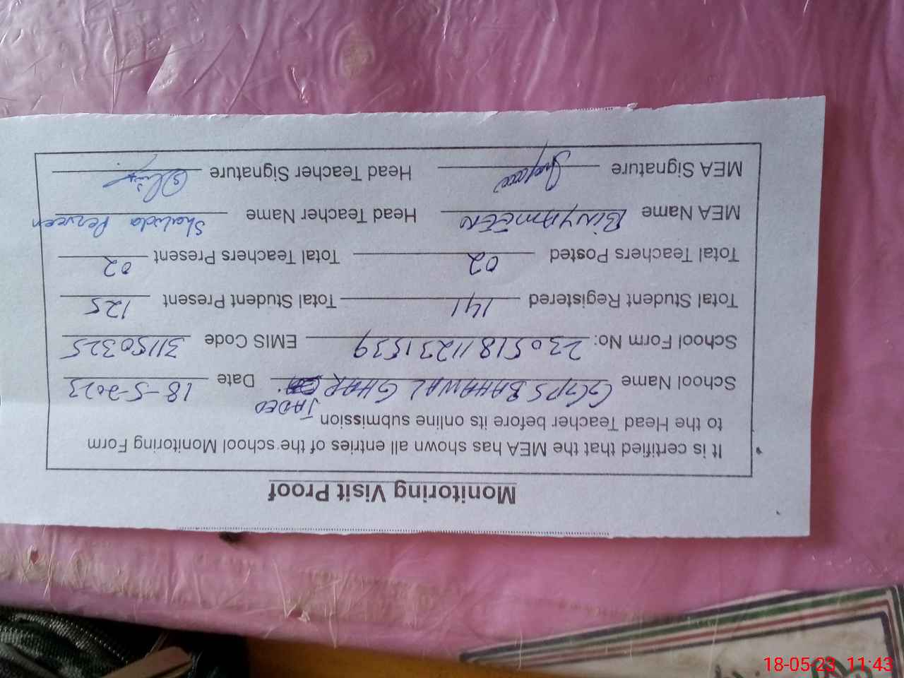 | Attendance Register | Head Teacher | MEA with School | Visit Proof |