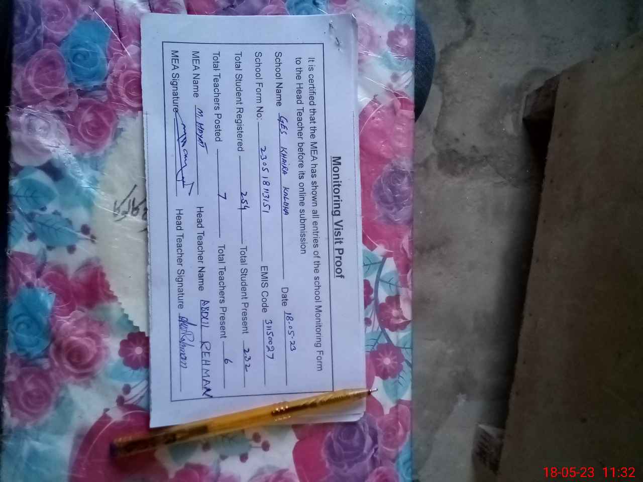 | Attendance Register | Head Teacher | MEA with School | Visit Proof |