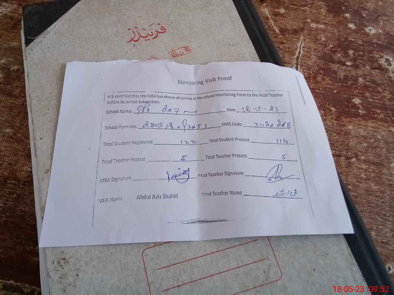 | Attendance Register | Head Teacher | MEA with School | Visit Proof |