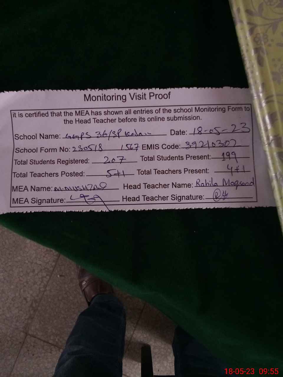 | Attendance Register | Head Teacher | MEA with School | Visit Proof |