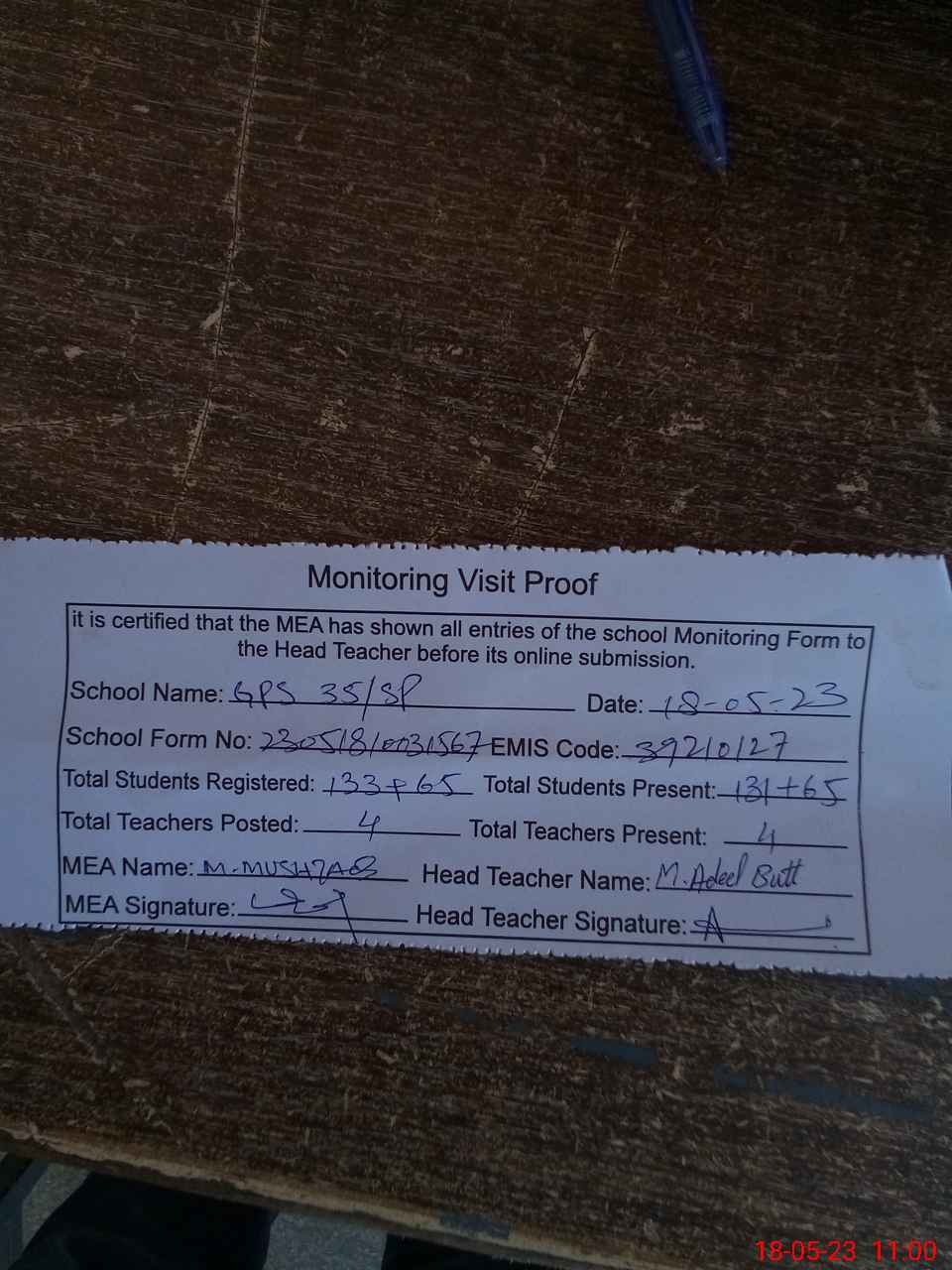 | Attendance Register | Head Teacher | MEA with School | Visit Proof |