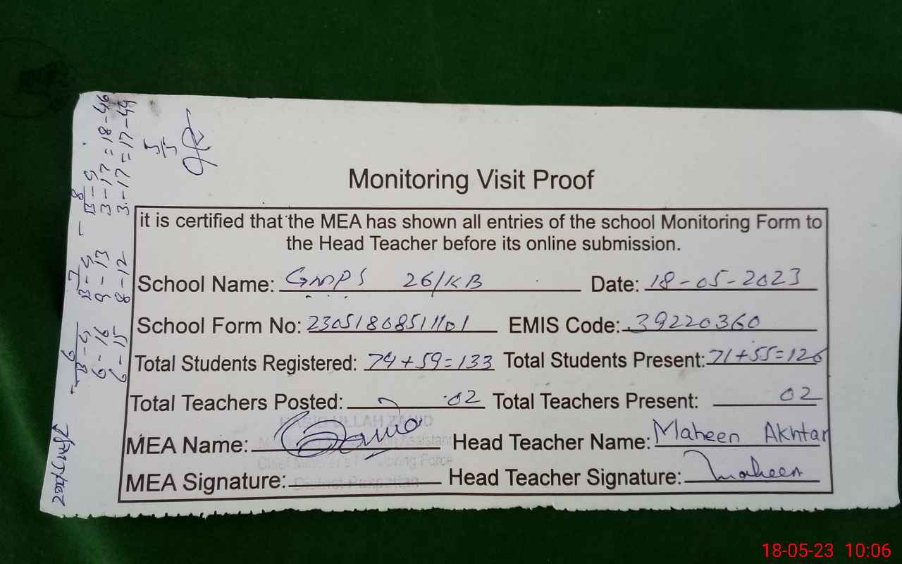 | EMIS Code: 39220360 | Name of School: GMPS CHAK NO 26 KB | |||