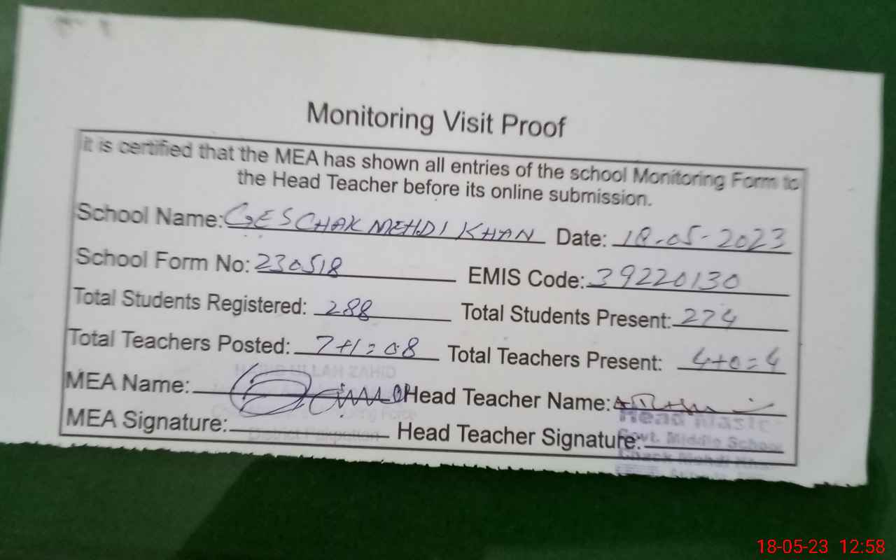 | Attendance Register | Head Teacher | MEA with School | Visit Proof |
