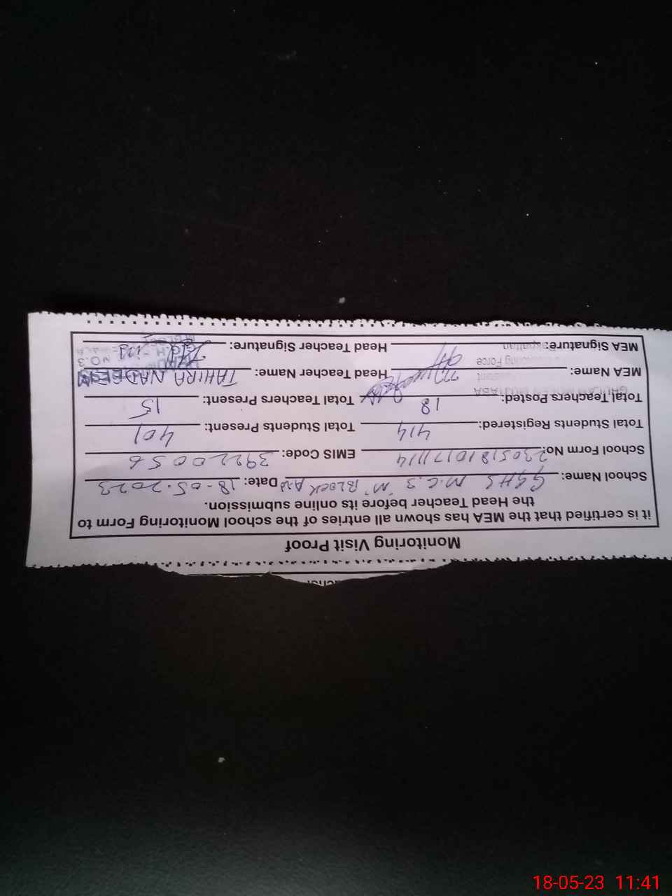 | Attendance Register | Head Teacher | MEA with School | Visit Proof |