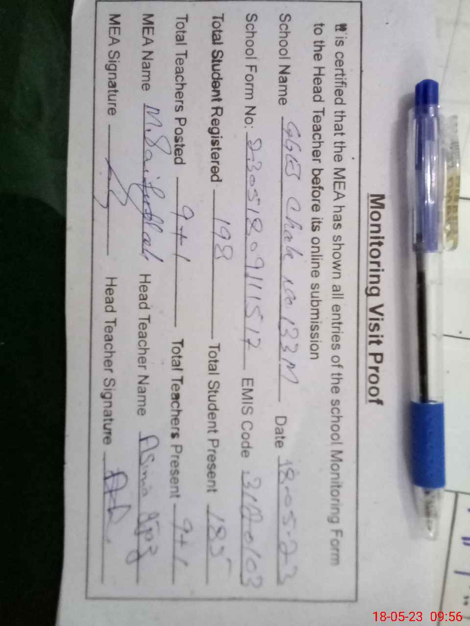 | Attendance Register | Head Teacher | MEA with School | Visit Proof |